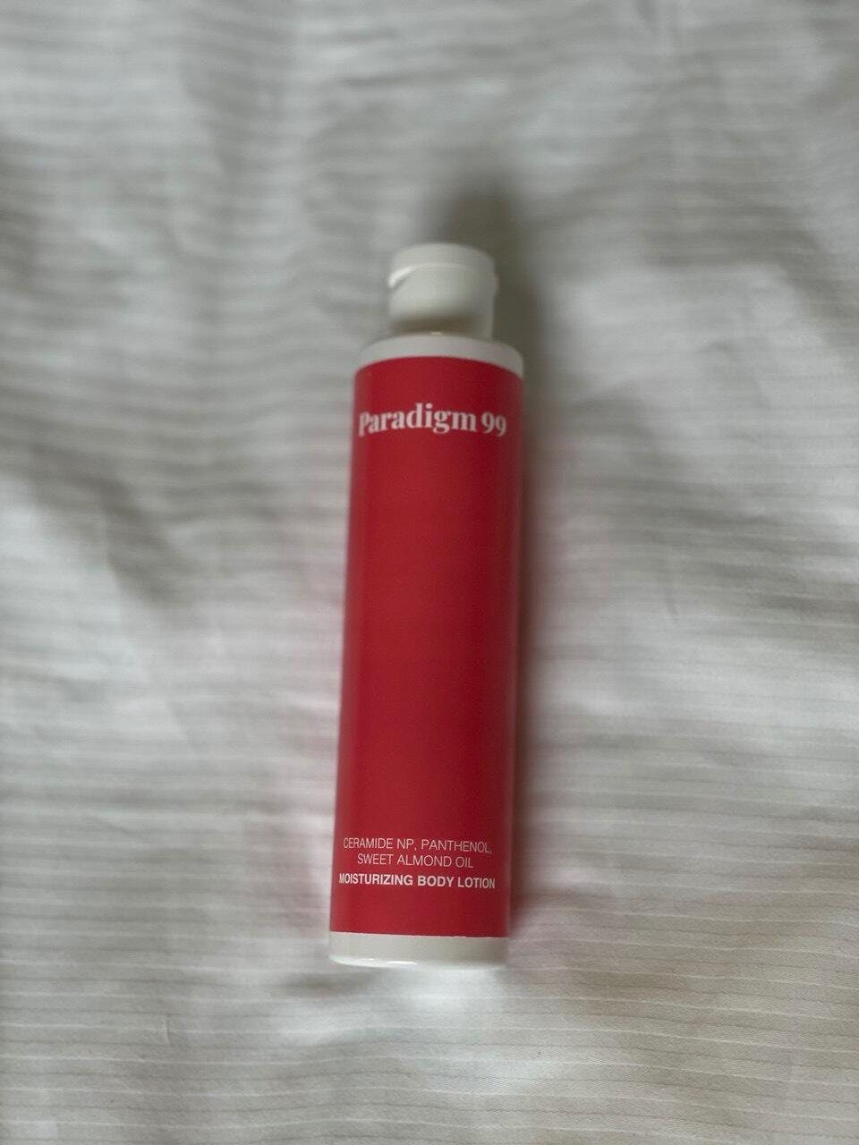 Paradigm 99 moisturizing body lotion with beauty box packaging on a pink background.